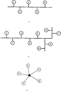 В основу классификации ТВС положены наиболее характерные функциональные, информационные и структурные признаки. По степени территориальной рассредоточенности элементов сети (абонентских систем, узлов связи) различают глобальные (государственные). региональные и локальные вычислительные сети (ГВС, РВС и ЛВС). По характеру реализуемых функций сети делятся на вычислительные (основные функции таких сетей - обработка информации), информационные (для получения справочных данных по запросам пользователей), информационно-вычислительные, или смешанные, в которых в определенном, непостоянном соотношении выполняются вычислительные и информационные функции. По способу управления ТВС делятся на сети с централизованным (в сети имеется один или несколько управляющих органов), децентрализованным (каждая АС имеет средства для управления сетью) и смешанным управлением, в которых в определенном сочетании реализованы принципы централизованного и децентрализованного управления (например, под централизованным управлением решаются только задачи с высшим приоритетом, связанные с обработкой больших объемов информации). По организации передачи информации сети делятся на сети с селекцией информации и маршрутизацией информации. В сетях с селекцией информации, строящихся на основе моноканала, взаимодействие АС производится выбором (селекцией) адресованных им блоков данных (кадров): всем АС сети доступны все передаваемые в сети кадры, но копию кадра снимают только АС, которым они предназначены. В сетях с маршрутизацией информации для передачи кадров от отправителя к получателю может использоваться несколько маршрутов. Поэтому с помощью коммуникационных систем сети решается задача выбора оптимального (например, кратчайшего по времени доставки кадра адресату) маршрута. По типу организации передачи данных сети с маршрутизацией информации делятся на сети с коммутацией цепей (каналов), коммутацией сообщений и коммутацией пакетов. В эксплуатации находятся сети, в которых используются смешанные системы передачи данных. По топологии, т.е. конфигурации элементов в ТВС, сети делятся на два класса: широковещательные (рис. 16.1) и последовательные (рис. 16.2). Широковещательные конфигурации и значительная часть последовательных конфигураций (кольцо, звезда с интеллектуальным центром, иерархическая) характерны для ЛВС. Для глобальных и региональных сетей наиболее распространенной является произвольная (ячеистая топология). Нашли применение также иерархическая конфигурация и «звезда». В широковещательных конфигурациях в любой момент времени на передачу кадра может работать только одна рабочая станция (абонентная система). Остальные PC сети могут принимать этот кадр, т.е. такие конфигурации характерны для ЛВС с селекцией информации. Основные типы широковещательной конфигурации - общая шина, дерево, звезда с пассивным центром. Главные достоинства ЛВС с общей шиной - простота расширения сети, простота используемых методов управления, отсутствие необходимости в централизованном управлении, минимальный расход кабеля. ЛВС с топологией типа «дерево» - это более развитый вариант сети с шинной топологией. Дерево образуется путем соединения нескольких шин активными повторителями или пассивными размножителями («хабами»), каждая ветвь дерева предс