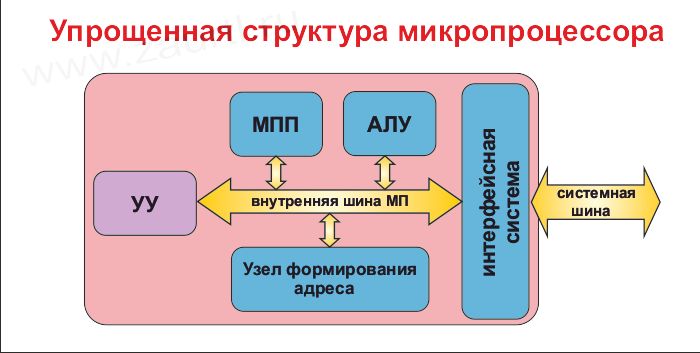 Устройство управления (УУ) – является функционально наиболее сложным устройством микропроцессора. Оно вырабатывает управляющие сигналы во все блоки МП и компьютера с целом для исполнения заданной команды. Арифметико-логическое устройство (АЛУ) – предназначено для выполнения арифметических и логических операций преобразования информации. Микропроцессорная память (МПП) – сверхбыстродействующая память, выполненная на регистрах и используемая микропроцессорам при непосредственном выполнении команд. Количество регистров МПП составляет несколько десятков. Узел формирования адреса - блок, отвечающий за формирования адресов для выбора следующих команд или данных. Интерфейсная система – выводы и схемы сопряжения, предназначенные для эффективной передачи адресов, данных, команд и управляющих сигналов. Внутренняя шина МП – обеспечивает связь составляющих частей микропроцессора. При включении микропроцессора интерфейсная система вводит команду по системной шине в устройство управления. В устройстве управления код команды дешифрируется и создается последовательность микрокоманд. Устройство управления согласно микрокомандам переключает (управляет) блоками процессора и компьютера заставляя им выполнять необходимые действия для исполнения заданной команды. Одновременно с этим формируется адрес для загрузки следующей команды или данных, если это необходимо. Такая организация выполнения команд по одной цепочке имеется в скалярных микропроцессорах. Начиная с процессоров Pentium, и им совместимые относятся к суперскалярным МП и способны выполнять несколько команд параллельно. В действительности структура процессора довольна сложна. В помощь процессору может использоваться кэш-память, математический сопроцессор, графический сопроцессор, сопроцессоры ввода-вывода, разгружающие центральный процессор от несложных операций взаимодействия с устройствами. В современных процессорах может находиться несколько ядер работающих параллельно на уровне оперативной памяти.