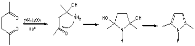 Наиболее общий лабораторный метод синтеза производных пиррола заключается во взаимодействии монооксимов -дикетонов с кетонами в уксусной кислоте в присутствие цинка (синтез Кнорра). Суть этого превращения заключается в том, что на первой стадии реакции оксимная группа восстанавливается цинком в кислой среде в аминогруппу. Кетонная группа в этих условиях не затрагивается. Далее происходит конденсация образующегося -аминокетона с кетоном, а за этим следует циклизация. Побочным продуктом в этой реакции является дигидропиразин, образующийся в результате конденсации двух молекул аминокетона между собой (стр. 68).