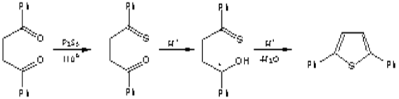 ü Получение фурана,пиррола,тиофена и их гомологов из 1,4-дикетонов. Пиррол, фуран, тиофена и их производные могут быть получены из одних и тех же предшественников – 1,4-дикарбонильных соединений. Этот метод называется синтезом Пааля-Кнорра. Так, производные фурана образуются при действии на 1,4-дикетоны дегидратирующими веществами – (Р2О5, H2SО4, ZnCl2 и др.). При взаимодействии с аммиаком или первичными аминами образуются производные пиррола. Реакция с неорганическими сульфидами, например с P2S5 приводит к образованию производных тиофена.