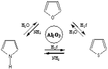 Поскольку образование гетероцикла пиррола, фурана и тиофена может происходить из одних и тех же исходных 1,4-дикарбонильных соединений, в соответствующих условиях возможны и их взаимопревращения. Эта реакция была открыта Юрьевым и носит его имя. Превращения происходят при нагревании гетероцикла в присутствие окиси алюминия при 400 °С в токе H2S, NH3 или H2O, однако высокий выход достигается только в случае использования фурана в качестве исходного соединения.