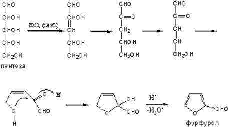 Декарбоксилирование пирослизевой кислоты является методом получения фурана. Промышленным способом получения фурфурола – фуран-2-карбальдегида является кислотный гидролиз полисахаридов, в состав которых входят пентозы – пятиатомные сахара, содержащиеся в различном растительном сырье. Так, фурфурол получают из шелухи семян подсолнечника, кукурузных початков, соломы, отрубей, вследствие чего он и получил свое название (латинское furfur – отруби).