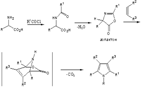 ü ПРЕДЛОЖИТЕ МЕХАНИЗМ РЕАКЦИИ ДЛЯ СТАДИИ ОБРАЗОВАНИЯ ЦИКЛА В СИНТЕЗЕ ПИРРОЛОВ ПО КНОРРУ. ПРИ ВЗАИМОДЕЙСТВИИ -АМИНОКЕТОНОВ С ЭФИРАМИ АЦЕТИЛЕНДИКАРБОНОВОЙ КИСЛОТЫ МОГУТ БЫТЬ ПОЛУЧЕНЫ ПРОИЗВОДНЫЕ ПИРРОЛА, А ПРИ ВЗАИМОДЕЙСТВИИ -ОКСИКЕТОНОВ (АЦИЛОИНОВ) С ТЕМ ЖЕ РЕАГЕНТОМ – ПРОИЗВОДНЫЕ ФУРАНА. ПРЕДЛОЖИТЕ МЕХАНИЗМ ЭТИХ ПРЕВРАЩЕНИЙ И ОХАРАКТЕРИЗУЙТЕ УСЛОВИЯ, В КОТОРЫХ ОНИ БУДУТ ПРОИСХОДИТЬ. С высоким выходом замещенные пирролы образуются при взаимодействии азлактонов с ацетиленами. Азлактоны -гетероциклические соединения, образующиеся при взаимодействии аминокислот с хлорангидридами карбоновых кислот. Замыкание азлактонного цикла представляет, по сути, модификацию, приводящую одновременно к увеличению кислотности С-Н связи углерода, связанного с атомом азота. Вследствие этого азлактон способен вступать в реакцию присоединения по Михаэлю по ацетиленовой кратной связи. Далее следует замыкание цикла по связи C=N в составе азлактонного цикла и отщепление молекулы CO2, завершающее образование пиррольного цикла.