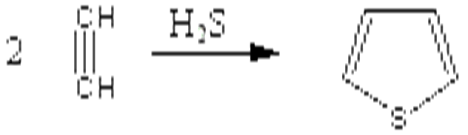 Тиофен может быть получен в лабораторных условиях взаимодействием динатриевой соли янтарной кислоты с P2S3. Этот метод интересен тем, что и замещенные янтарные кислоты в тех же условиях образуют соответствующие замещенные производные тиофена. Еще одно превращение, при котором образуется тиофен, открытое Чичибабиным, заключается во взаимодействии ацетилена с сероводородом при 400-450 °С на окиси алюминия. Эта реакция не имеет препаративного значения, однако, интересна своим сходством с реакций, тримеризации ацетилена с образованием бензола.