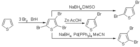 ü Галогенирование тиофена происходит очень быстро и как при комнатной температуре, так и при -30 °С в темноте легко проходит тетразамещение. Скорость галогенирования тиофена при 25 °С примерно в 108 раз больше, чем бензола. Образование как 2,5-дибром - и 2,5-дихлортиофенов, так и 2-бром- и 2-иодтиофенов гладко происходит в различных контролируемых условиях. Контролируемое бромирование 3-бромтиофена дает 2,3-ди-бромтиофен.