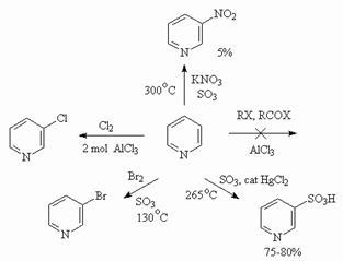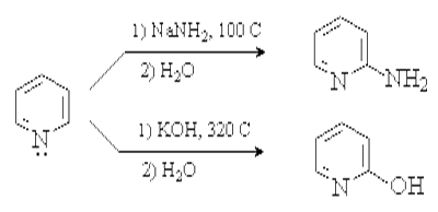 Наиболее характерными для пиридина являются реакции нуклеофильного замещения, которые идут по положениям 2 и 4. Примерами таких реакций является взаимодействие пиридина с амидом натрия (реакция Чичибабаина) и со щелочами.
