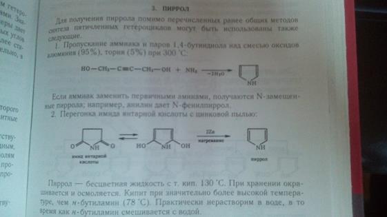 Далее фурфурол превращают в пирослизевую кислоту либо по реакции Канницаро, либо окислением кислородом воздуха в присутствии щелочных растворов солей меди или серебра, Полученную кислоту декарбоксилируют в фуран нагреванием до 200-250° С. Сам фурфурол так же может быть превращен в фуран нагреванием при 400 С в присутствии катализаторов – хромитов цинка или марганца. Пиррол в промышленности получают фракционной перегонкой каменноугольной смолы и костяного масла – вещества, образующегося при сухой перегонке костей. Кроме того, его получают из фурана по методу Юрьева, а также взаимодействием ацетилена с формальдегидом и аммиаком. Сукцинимид, по сути, является производным пиррола и может быть превращен в пиррол восстановлением цинком.