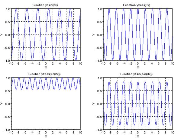 title - заголовок, который будет выводится над графической областью; x-leg, y-leg - подписи осей графика X и Y; x, y - координаты верхнего левого угла области в графическом окне, w - ширина, h - высота окна. Значения x, y, w, h измеряются в относительных единицах и лежат в диапазоне [0, 1]. После определения области в нее можно вывести график функции с помощью команды plot. Пример. Построить графики функций Допустим, что Используя параметр rect как самостоятельную команду, задаем шаблон размера координатных осей каждой области построения кривой. Теперь ось X будет ограничена минимальным и максимальным значением Командой tics указываем, что на всех выводимых графиках, во всех областях на оси абсцисс, должно быть 11 основных и по 2 промежуточных деления, на оси ординат-5 основных и по 10 промежуточных делений. Для создания областей внутри графического окна используем функцию plotframe со всеми параметрами: прорисовыванием сетки комбинацией значений (%t) и (%f), выводом подписи графика и координатных осей, а также разметкой каждой из областей - массив, в котором первые два числа-координаты верхнего левого угла, а последние два - ширина и высота области. Для формирования нового графика после каждого вызова функции plotframe выполняем функцию plot(x,y). x=[-10:0.01:10];y=sin(2*x); z=cos(3*x); u=cos(sin(2*x)); v=sin(cos(3*x));rect=[min(x),-1,max(x),1];tics=[2,11,10,5]; plotframe (rect,tics,[%t,%t],["Function y=sin(2x)",..."X","Y"], [0,0,0.5,0.5]); plot (x,y); plotframe (rect,tics,[%f,%f],["Function y=cos(3x)",..."X","Y"], [0.5,0,0.5,0.5]); plot (x,z); plotframe (rect,tics,[%f,%f],["Function y=cos(sin(2x))",..."X","Y"], [0,0.5,0.5,0.5]); plot (x,u); plotframe (rect,tics,[%t,%t],["Function y=sin(cos(3x))",..."X","Y"], [0.5,0.5,0.5,0.5]); plot (x,v) Еще одним способом изображения нескольких графиков в одном окне является использование функции subplot. Она также разделяет графическое окно на несколько отдельных областей, однако, по мнению авторов, имеет более простой синтаксис. Обращение к ней имеет вид: subplot(m,n,p) или subplot(mnp) Выполнение функции приводит к тому, что графическое окно разбивается на m окон по вертикали и n окон по горизонтали, текущим окном становится окно с номером p. Пример. Построить графики функций Пусть x изменяется на интервале [−10: 10] с шагом 0,01. Сформируем массивы значений функций Y, Z, U, V, W, R. C помощью функции subplot разбиваем графическое окно на заданное количество областей. Определимся, что в каждом столбце по вертикали должно быть 3, а по горизонтали 2 области для вывода графиков. Третье число в записи функции subplot указывает, в которую из областей (счет ведется по порядку - слева направо и сверху вниз) выводится график, формируемый функцией plot(x,y). x=[-10:0.01:10];y=sin(x); z=cos(x);u=cos(sin(x)); v=sin(cos(x));w=exp(sin(x)); r=exp(cos(x)); subplot (3,2,1); plot (x,y); subplot (3,2,2); plot (x,z); subplot (3,2,3); plot (x,u); subplot (3,2,4); plot (x,v); subplot (3,2,5); plot (x,w); subplot (3,2,6); plot (x,r);