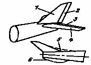 . Однокилевое оперение: 1 - киль; 2 - руль направления; 3 - руль высоты; 4 - стабилизатор; 5 - килевой гребень; 6 - подфюзеляжный киль