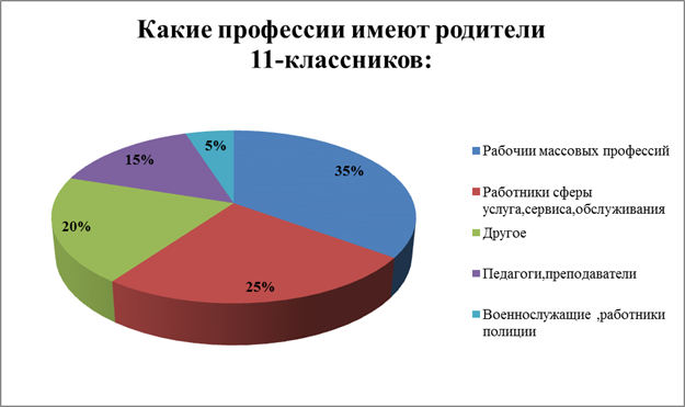 7. Так же по результатам опроса мы выяснили,что наиболее популярные профессии родители 11-классников имеют: - Рабочие массовые профессий - Работники сферы услуг, сервиса, обслуживания - Другое - Педагоги, преподаватели - Военнослужащие, работники полиции