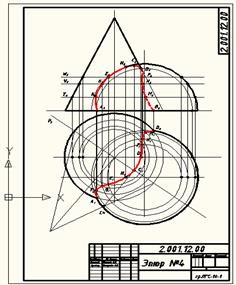 Порядок выполнения. На формате в тонких линиях вычерчивается задание. Данные для вычерчивания комбинированной поверхности взять из таблицы зада- ний согласно варианту. Сложная поверхность состоит из двух по Рис.89 верхностей – поверхности вращения (цилиндра, конуса, сферы) и многогранной поверхности (пирамиды, призмы).По двум заданным проекциям (горизонтальной и фронтальной) построить третью проекцию – профильную. Задачу решаем в два этапа: 1 этап - построить проекции сечения. Так как секущая плоскость – плоскость частного положения, одна проекция сечения совпадает с проекцией этой плоскости, другие проекции строят по точкам пересечения линий каркаса заданных поверхностей с плоскостью. Линиями каркаса многогранной поверхности являются боковые ребра и ребра основания. Точки пересечения ребер с заданной секущей плоскостью определяются сначала на фронтальной проекции,, а затем по линиям проек- ционной связи - на горизонтальной и профильной проекциях. Линия пересечения – треугольник EFG. На поверхности полусферы сначала строят точки очевидные – точки пересечения очерков поверхности с плоскостью W. Затем строят точки вспомогательные при помощи вспомогательных секущих плоскостей. На горизонтальной и профильной проекциях полученные точки соединяют в определенном порядке. Получаются кривые линии – участки эллипсов. Затем определяют видимость линии сечения. 2 этап - определить натуральную величину сечения методом замены плоскостей проекций. Оформление чертежа. Линию сечения обводят красным цветом с учетом видимости. Сечение на всех проекциях заштриховать под углом 45 градусов к рамке листа. Основную надпись заполнить по установленной форме. Задание на 3-й эпюр выдается на10-й неделе. Проверка эпюра – на 11-12 неделе. Зачет эпюра – на 12 неделе. Эпюр №4