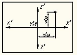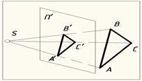 Рис.103 Построение линейной перспективы методом координат Линейная перспектива – перспектива, построенная на вертикальной плоскости. Перспектива выполняется по ортогональным проекциям. Аппарат проецирования в линейной перспективе представлен на рис.104 и состоит из следующих элементов: Т – предметная плоскость; К – плоскость картины (К Т); Н – плоскость горизонта, проходящая через точку зрения (Н Т); W – главная вертикальная плоскость (W К); S – точка зрения (глаза шофера); s – основание точки зрения, проекция точки S на плоскость Т; Р – главный луч (Р К); Рр=Ss – высота точки зрения; t1 – t2 – линия основания картины;h1–h2 – линия горизонта. Рассмотрим построение перспективы точки А, находящейся в пространстве, на картинную плоскость методом координат. С точкой зрения S совместим точку О – начало прямоугольной системы координат OXYZ. Спроецируем эту систему координат на картинную плоскость O*X*Y*Z* -система координат в перспективе. Построим перспективу точки А на плоскость К – точку А*, проведя через точку А и точку S луч зрения. Перспективные координаты точки А* - X*, Z* (координата Y- отсутствует, так как, точка А* принадлежит картинной плоскости, являющейся перспективной координатной плоскостью). Расстояние от точки S до картинной плоскости – главное расстояние – f. Рассматриваем подобные треугольники SAyAw и SPA*w получим: Paw*/Ay Aw = SP/Say, или z*/z = f/y. Отcюда: z*=z(f/y) (1) Так же определяется значение Х, которое выражается зависимостью: x*=x(f/y) (2) Пример. Построить перспективу точки А (х=200, у=500, z=150). Расстояние точки зрения от картинной плоскости f=100 x*=x(f/y); x*=200(100/500)=40; z*=z(f/y); z*=150(100/500)=30 Построение перспективы точки А* по значениям x* и z* показано на рис.146.