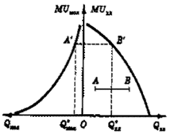 Рис. 2. Графическая иллюстрация закона Госсена. Взаимосвязь между предельной полезностью хлеба и молока.В первом квадранте изображен график предельной полезности хлеба, во втором - молока. При этом единицы измерения натуральных количеств обоих продуктов выбраны таким образом, чтобы в единицу времени можно было потребить либо единицу хлеба, либо единицу молока. Отрезок АВ представляет количество времени, которым располагает субъект для потребления выбранных продуктов питания. Чтобы определить равновесную структуру потребления, потребителю достаточно поднять "планку" АВ (сохраняя ее горизонтальное положение) до "упора", чтобы она заняла положение A`B`. Проекции точек "упора" на ось абсцисс укажут искомый набор потребляемых благ: Qхл*, Qмол*. Недостатки количественного подхода: не существует единиц для объективного измерения полезности различных товаров; предельная полезность денег не постоянна, она изменяется с изменением дохода, а значит деньги не могут служить мерой полезности. Кривые безразличия - Линия, соединяющая потребительские наборы (x1, x2), имеющие один и тот же уровень удовлетворения потребностей потребителя, называется линией безразличия. Линии уровня есть не что иное, как линии уровней функции полезности. Т.е. кривая безразличия- линия каждая точка которой представляет собой наборы благ (х1 :х2), равноценных для потребителя с точки зрения полезности. Множество линий безразличия называется картой линий безразличия. Каждая кривая безразличия представляет собой наборы потребительских товаров и услуг, которые человек оценивает одинаково. На рис. 1 показаны три кривые безразличия, которые образуют часть карты кривых безразличия. Кривая безразличия U3 соответствует наивысшему уровню удовлетворения потребностей, затем следует кривая безразличия U2 и U1. Свойства функции полезности означают, что линия безразличия убывает (является нисходящей) и строго выпукла к началу координат. Для пояснения этого рассмотрим дифференциал функции u(x1, x2). Если двигаться вдоль линии уровня, то приращение функции u(xl,x2) равно нулю, и, следовательно, можно считать равной нулю его главную линейную часть.