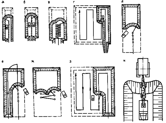 Рис. 8. Схема разработки котлованов одноковшовыми экскаваторами. а - лобовая проходка прямой лопаты с односторонней погрузкой грунта в самосвалы; б - то же, с двухсторонней погрузкой, в - то же, с зигзагообразным перемещением экскаватора, г - боковая проходка, д. - торцовая проходка обратной лопаты или драглайна; е - то же, при большей ширине котлована, ж - то же, с зигзагообразным перемещением экскаватора, з. - боковая проходка, и — продольно-челночная проходка драглайна Обратной лопатой экскаватор разрабатывает грунт «на себя» с торцовой или боковой проходкой. При торцовом забое (рис. 8,д,е,ж) экскаватор перемещается по оси отрываемой им траншеи или котлована, попеременно разрабатывая грунт то с одной, то с другой стороны в зависимости от того, куда подходят транспортные средства. Если грунт разрабатывают с одной стороны оси движения экскаватора, то образуется боковой забой (рис. 8,з). Экскаваторы с обратной лопатой целесообразно применять для отрывки траншей и котлованов глубиной до 6 м. Экскаватор, оборудованный драглайном, разрабатывает грунт аналогично экскаватору с обратной лопатой. Но более эффективной схемой разработки является челночная, так как ковш драглайна имеет гибкую подвеску. При этой схеме транспортные средства подходят по дну котлована и угол поворота экскаватора при выгрузке грунта будет минимальным (рис. 8,и). Разработка грунта многоковшовыми экскаваторами. Многоковшовые экскаваторы являются машинами непрерывного действия и отличаются высокой производительностью. Рабочим органом у них являются ковши, насаженные через равные интервалы на замкнутой цепи или колесе (ротор), в зависимости от чего различают экскаваторы цепные и роторные (рис. 9).