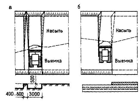 Эта схема в два раза уменьшает число полных разворотов скрепера, что повышает его производительность. При чередовании насыпи и выемки наиболее эффективной схемой работы скрепера является сдвоенная проходка (рис. 6.10.в.г). Дальность транспортировки грунта прицепными скреперами - до 1000 м, самоходными - до 3000 м. Бульдозерами разрабатывают грунт в неглубоких и протяженных выемках и резервах для перемещения его в насыпь на расстояние до 100 м. Бульдозерами также обваловывают, разравнивают и планируют грунт, зачищают дно котлованов после экскаваторной разработки. Они часто входят в комплект оборудования, обеспечивающего комплексную механизацию земляных работ, разравнивая грунт, доставляемый различными транспортными средствами. Разработку выемок бульдозером ведут ярусами, равными толщине слоя, снимаемого за один проход. При этом обеспечивают работу бульдозера под уклон. На планировочных работах грунт разрабатывают преимущественно траншейным или послойным способом. В первом случае ярусы глубиной 400...500 мм разрабатывают траншеями шириной в отвал бульдозера, оставляя между ними нетронутый грунт полосами 400...600 мм (рис. 11,а). Их срезают бульдозером в последнюю очередь.