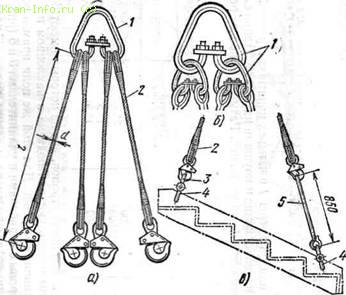Рис. 132. Стропы с несколькими ветвями: а —четырехветвевой (паук) с одной серьгой, б — то же, с тремя серь-1ами, в — использование паука с удлинителями для подъема лестничных маршей; 1 — серьга, 2 — строп, 3, 5 — удлинители, 4 — карабин