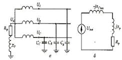 В нормальном режиме работы сети всегда имеется небольшое смещение нейтрали, т.е. потенциал нейтрали всегда отличен от нуля. Это происходит из-за несимметрии фаз линий электропередачи, исключить которую в распределительных сетях не удается. Смещение нейтрали составляет обычно 3-4% фазного напряжения, что вполне допустимо и не представляет опасности. Но при включении дугогосящего реактора в нейтраль ее потенциал может существенно увеличиться. Рассмотрим схему сети (см. рисунок 6.3).