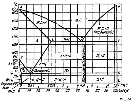 Структурные составляющие железоуглеродистых сплавов. - раздел Образование, КРИСТАЛЛИЧЕСКОЕ СТРОЕНИЕ Основными Компонентами, От Которых Зависит Структура И Свойства Железоуглерод... Основными компонентами, от которых зависит структура и свойства железоуглеродистых сплавов, являются железо и углерод. Чистое железо - металл серебристо-белого цвета; температура плавления 1539°С. Железо имеет две полиморфные модификации: α и γ. Модификация α существует при температурах ниже 911°С и выше 1392°С; γ-железо — при 911-1392°С. В зависимости от температуры и концентрации углерода железоуглеродистые сплавы имеют следующие структурные составляющие. 1. Феррит (Ф) - твердый раствор внедрения углерода в α-железе. Растворимость углерода в α-железе при комнатной температуре до 0,005%; наибольшая растворимость - 0,02% при 727°С. Феррит имеет незначительную твердость (НВ 80-100) и прочность (σв=250 МПа), но высокую пластичность (δ=50%; ψ=80%). 2. Аустенит (А) - твердый раствор внедрения углерода в γ-железе. В железоуглеродистых сплавах он может существовать только при высоких температурах. Предельная растворимость углерода в γ-железе 2,14% при температуре 1147°С и 0,8% - при 727°С. Эта температура является нижней границей устойчивого существования аустенита в железоуглеродистых сплавах. Аустенит имеет твердостьНВ 160-200 и весьма пластичен (δ =40-50%). 3. Цементит (Ц) - химическое соединение железа с углеродом (карбид железа Fe3C). В цементите содержится 6,67% углерода. Температура плавления цементита около 1600°С. Он очень тверд (НВ-800), хрупок и практически не обладает пластичностью. Цементит неустойчив и в определенных условиях распадается, выделяя свободный углерод в виде графита по реакции Fe3C→3Fe+C. 4. Графит - это свободный углерод, мягок (НВ-3) и обладает низкой прочностью. В чугунах и графитизированной стали содержится в виде включений различных форм (пластинчатой, шаровидной и др.). С изменением формы графитовых включений меняются механические и технологические свойства сплава. 5. Перлит (П) - механическая смесь (эвтектоид, т.е. подобный эвтектике, но образующийся из твердой фазы) феррита и цементита, содержащая 0,8% углерода. Перлит может быть пластинчатым и зернистым (глобулярным), что зависит от формы цементита (пластинки или зерна) и определяет механические свойства перлита. При комнатной температуре зернистый перлит имеет предел прочности σв =800МПа; относительное удлинение δ =15%; твердость НВ 160. Перлит образуется следующим образом. Пластинка (глобула) цементита начинает расти или от границы зерна аустенита, или центром кристаллизации является неметаллическое включение. При этом соседние области объединяются углеродом и в них образуется феррит. Этот процесс приводит к образованию зерна перлита, состоящего из параллельных пластинок или глобулей цементита и феррита. Чем грубее и крупнее выделения цементита, тем хуже механические свойства перлита. 6. Ледебурит (Л) - механическая смесь (эвтектика) аустенита и цементита, содержащая 4,3% углерода. Ледебурит образуется при затвердевании жидкого расплава при 1147°С. Ледебурит имеет твердостьНВ 600-700 и большую хрупкость. Поскольку при температуре 727°С аустенит превращается в перлит, то это превращение охватывает и аустенит, входящий в состав ледебурита. Вследствие этого при температуре Диаграмма состояния железо — цементит (в упрощенном виде): А —