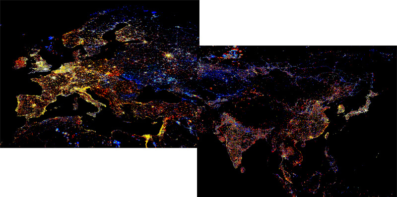 Результаты глобализации хорошо видны по ночной светимости планеты, которая используется как показатель плотности населения и уровня развития территорий. Обратите внимание на залитые синим цветом территории на скомпонованной фотографии Евразии из снимков 1993 и 2003 годов. Синим цветом обозначен вымерший за десятилетие свет. Наглядно видно, в какие места планеты стягивается "одеяло ресурсов" со всей остальной территории и где находится "периферия".
