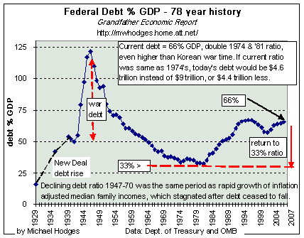 Посмотрите как благоприятно сказалась Вторая Мировая война на экономике США. (Хочу сразу опровергнуть сторонников Рузвельта и подчеркнуть, что, - "Из депрессии США вышли не по «Новому курсу» Рузвельта, а благодаря созданной под его руководством системе мобилизационной перестройки экономики в годы второй мировой войны. Оправдались пророческие слова Кейнса, с которыми он обратился к американскому народу 29 июля 1940 г. в журнале «Нью Рипаблик»: «Ваши военные приготовления не только не потребуют от вас жертв. Наоборот, они явятся тем стимулом к увеличению индивидуального потребления и росту жизненного уровня, который не смогли бы дать вам ни победа, ни поражение нового курса». Другими словами "ружье висящее на стене выстрелило".) На графике слева изображено соотношение государственного долга к ВВП. Страна явно находилась при смерти. Не помогало ни строительство дорог, ни общественные работы, проводимые "новым курсом". Отношение госдолга к ВВП уже 125%. Жизнь поддерживалась только вертикальным ростом государственного долга, который уже ничего не исправлял, - и тут вдруг привалило счастье. Чужая Война. Вся Европа в руинах, - но какая благодать для экономики штатов. Несмотря на то, что в абсолютных значениях госдолг практически не падает (см. график выше.), но по отношению к бешено растущему ВВП он резко снижается. Еще один, не такой резкий спад относительного уровня госдолга виден в начале 50-х. По странному временному совпадению, - корейская война 1950-1953 гг. (но правда эта война не "чужими руками"). Конечно такая примитивная историческая параллель абсолютно некорректна (факторов намного больше и самое главное, - отсутствует золотая привязка денег), - но сейчас госдолг США быстро растет а ВВП стагнирует. Что произойдет, когда госдолг превысит 125%?