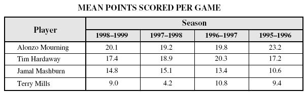 (впрочем и образование вообще, глядя как у нас обучение в высшей школе постепенно превращается в продажу диплома в рассрочку) Когда мне на глаза попались тесты для школьников Флориды, у меня волосы встали дыбом. Самый сложный тест по математике из найденных мною предлагал задачи уровня: Таблица показывает среднее число очков, выигранных в игру четырьмя профессиональными игроками баскетбола в четыре сезона. Какой игрок имел самый большой диапазон средних очков в течение сезонов, показанных в таблице? Варианты ответов: А. Alonzo Mourning B. Tim Hardaway C. Jamal Mashburn D. Terry Mills Или: Два паруса на лодке в диаграмме подобны. Какова длина AB?