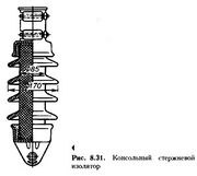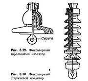 Zd 8 29.30.jpg Изоляторы – устройства для изоляции проводов контактной сети, находящихся под напряжением. Различают изоляторы по направлению приложения нагрузок и месту установки – подвесные, натяжные, фиксаторные и консольные; по конструкции – тарельчатые и стержневые; по материалу – стеклянные, фарфоровые и полимерные; к изоляторам относят также изолирующие элементы