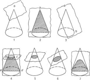 Прежде чем излагать взгляды психологов на проблему творческого мышления, рассмотрим некоторые факты, которые помогут лучше понять сформулированные дальше положения, касающиеся данного вида мышления. С самого начала отметим, что творческое мышление не обязательно связано только с одним из обсуждавшихся ранее видов мышления, скажем, словесно-логическим; оно вполне может быть и практическим, и образным. РАрнхейм отмечает, что видеть свойства какого-либо предмета — значит воспринимать его как пример воплощения определенного общего понятия, что всякое восприятие состоит в выделении ранее абстрагированных черт. «Следовательно, абстрактное содержится не только в мышлении, но и в других познавательных процессах»1. Ярким примером необходимости наглядно-образных представлений для более глубокого понимания абстрактных вещей и понятий может служить следующий пример. Оказывается, что такие различные геометрические понятия, как точка, прямая, треугольник, трапеция, окружность, эллипс, парабола, которые благодаря подкупающей простоте и законченности строения считались абстракциями, не зависящими от реальности, на самом деле связаны с ней и с конкретно-образными представлениями. Рисунок 52 наглядно демонстрирует, что все эти абстракции можно «увидеть» на различных сечениях плоскостью обыкновенного конуса. Точка получается, если плоскость проходит через вершину конуса (52.1); треугольник образуется при пересечении плоскостью конуса по его оси (52.2); отрезок прямой линии можно получить, если плоскость проходит как касательная к боковой поверхности конуса (52.3); трапеция образуется в случае, если от треугольника, образуемого сечением 52.2, отделяется верхняя часть при помощи плоскости, параллельной основанию (52.4); круг можно получить, сделав поперечное сечение конуса плоскостью, параллельной основанию (52.5), эллипс образуется таким же сечением, но проведенным под наклоном (52.6); парабола вырисовывается в случае, если секущая плоскость проходит параллельно оси конуса, но не через ее саму (52.7). Таким образом, меняя расположение и взаимную ориентацию конуса и секущей плоскости, можно не только получить ряд фигур, выражающих абстрактные понятия, но и незаметно, в наглядно-действенном плане переходить от одного абстрактного понятия к другому. По этому поводу Р.Арнхейм пишет, что элементы мышления в восприятии и восприятия в мышлении взаимно дополняют друг друга. «Они превращают человеческое познание в