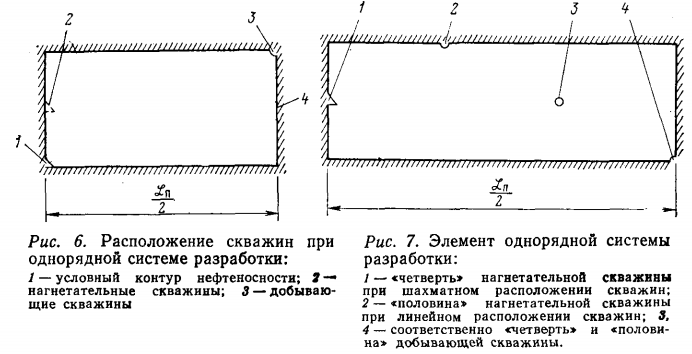 2.2. Системы с внутриконтурным воздействием, подразделяются на 2.2.1. Рядные системы разработки. Разновидность их — блоковые системы. При этих системах на месторождениях, обычно в направлении, поперечном их простиранию, располагают ряды добывающих и нагнетательных скважин. Практически применяют однорядную, трехрядную и пятирядную схемы расположения скважин, представляющие собой соответственно чередование одного ряда добывающих скважин и ряда нагнетательных скважин, трех рядов добывающих и одного ряда нагнетательных скважин, пяти рядов добывающих и одного ряда нагнетательных скважин. Число рядов в рядных системах нечетное вследствие необходимости проводки центрального ряда скважин, к которому предполагается стягивать водонефтяной- раздел при его перемещении в процессе разработки пласта. Однорядная система разработки. Расположение скважин при такой системе показано на рис. 6. Рядные системы разработки необходимо характеризовать уже некоторыми иными параметрами (помимо указанных четырех основных). Так, помимо расстояния между нагнетательными скважинами и