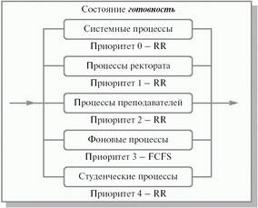 Многоуровневые очереди (Multilevel Queue) Для систем, в которых процессы могут быть легко рассортированы по разным группам, был разработан другой класс алгоритмов планирования. Для каждой группы процессов создаётся своя очередь процессов, находящихся в состоянии готовность (см. рис. 3.5). Этим очередям приписываются фиксированные приоритеты. Например, приоритет очереди системных процессов устанавливается выше, чем приоритет очередей пользовательских процессов. А приоритет очереди процессов, запущенных студентами, ниже, чем для очереди процессов, запущенных преподавателями. Это значит, что ни один пользовательский процесс не будет выбран для исполнения, пока есть хоть один готовый системный процесс, и ни один студенческий процесс не получит в своё распоряжение процессор, если есть процессы преподавателей, готовые к исполнению. Внутри этих очередей для планирования могут применяться самые разные алгоритмы. Так, например, для больших счётных процессов, не требующих взаимодействия с пользователем (фоновых процессов), может использоваться алгоритм FCFS, а для интерактивных процессов – алгоритм RR. Подобный подход, получивший название многоуровневых очередей, повышает гибкость планирования: для процессов с различными характеристиками применяется наиболее подходящий им алгоритм.