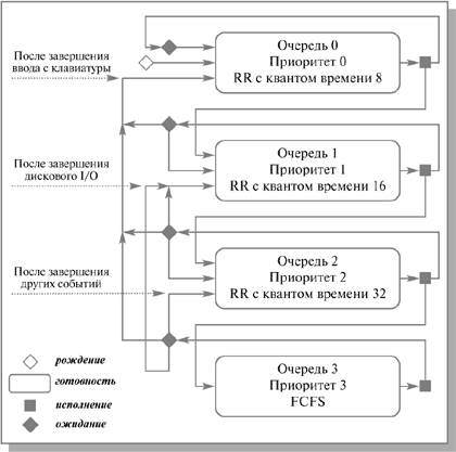 Родившийся процесс поступает в очередь 0. При выборе на исполнение он получает в своё распоряжение квант времени размером 8 единиц. Если продолжительность его CPU burst меньше этого кванта времени, процесс остаётся в очереди 0. В противном случае он переходит в очередь 1. Для процессов из очереди 1 квант времени имеет величину 16. Если процесс не укладывается в это время, он переходит в очередь 2. Если укладывается – остаётся в очереди 1. В очереди 2 величина кванта времени составляет 32 единицы. Если для непрерывной работы процесса и этого мало, процесс поступает в очередь 3, для которой квантование времени не применяется и, при отсутствии готовых процессов в других очередях, может исполняться до окончания своего CPU burst. Чем больше значение продолжительности CPU burst, тем в менее приоритетную очередь попадает процесс, но тем на большее процессорное время он может рассчитывать. Таким образом, через некоторое время все процессы, требующие малого времени работы процессора, окажутся размещёнными в высокоприоритетных очередях, а все процессы, требующие большого счета и с низкими запросами к времени отклика, – в низкоприоритетных. Миграция процессов в обратном направлении может осуществляться по различным принципам. Например, после завершения ожидания ввода с клавиатуры процессы из очередей 1, 2 и 3 могут помещаться в очередь 0, после завершения дисковых операций ввода-вывода процессы из очередей 2 и 3 могут помещаться в очередь 1, а после завершения ожидания всех других событий – из очереди 3 в очередь 2. Перемещение процессов из очередей с низкими приоритетами в очереди с высокими приоритетами позволяет более полно учитывать изменение поведения процессов с течением времени. Многоуровневые очереди с обратной связью представляют собой наиболее общий подход к планированию процессов из числа подходов, рассмотренных нами. Они наиболее трудны в реализации, но в то же время обладают наибольшей гибкостью. Понятно, что существует много других разновидностей такого способа планирования, помимо варианта, приведённого выше. Для полного описания их конкретного воплощения необходимо указать: