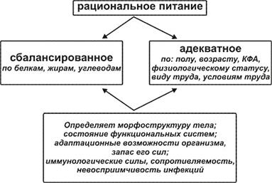 · Гигиенические основы рационального питания. Критерии оценки рационального питания. Пища - важнейший субстрат окружающей среды, оказывающий постоянное и очень существенное влияние на жизнедеятельность организма здорового и больного. Клетчатка и пектин сорбируют соли тяжёлых металлов и радионуклидов, усиливая перистальтику кишечника, ускоряют механическое их выведение из организма. При составлении полноценного рациона питания следует учесть, что приблизительно 40% пайка необходимо отводить продуктам животного происхождения, объем пищи должен дать чувство насыщения. Это чувство по времени связано с пребыванием пищи в желудке. В этом отношении наивысшим достоинством обладает мясная пища. Жареная пища сытнее, чем вареная. При кулинарной обработке необходимо сохранять максимум ценностей пищевых продуктов, особенно витаминов и микроэлементов. К пищевым наборам идет приспособление пищеварения, поэтому резкие изменения нецелесообразны. Определенное значение в пище имеют пряности, специи, горечи. Разработаны нормы физиологических потребностей в пищевых веществах и энергии для разных групп населения, СанПиН. Рациональное питание базируется на теории сбалансированного и адекватного питания. В рациональном питании необходимо учитывать принципы разделения продуктов по их ценности для организма: Продукты максимального ограничения - пищевой жир, сахар, сладости, прохладительные напитки, чипсы, колбасные изделия и продукты быстрого питания.