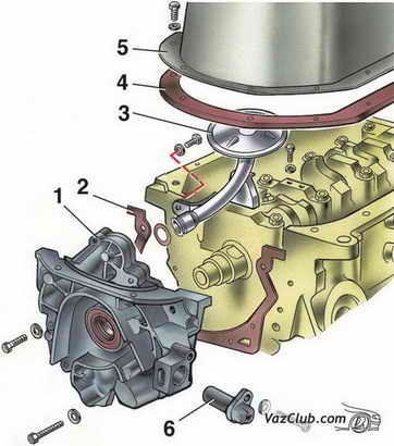 Снятие масляного насоса: 1 – масляный насос; 2 – прокладка масляного насоса; 3 – приемник масляного насоса; 4 – прокладка картера; 5 – картер; 6 – датчик положения коленчатого вала Затем снимите масляный картер 5 и масляный насос 1. Для снятия поршневой группы необходимо раскрутить гайки шатунных болтов и снять крышку.