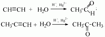 2) присоединение галогенов (галогенирование). HC≡CH + HCl → CH2=CHCl → CH3-CHCl2; На I ступени образуются дигалогеналкены, на II – тетрагалогеналканы. Реакция алкинов с бромной водой – качественная реакция на алкины. Бромная вода обесцвечивается; 3) присоединение галогеноводородов (гидрогалогенирование). На I ступени образуются моногалогеналкены, на II – дигалогеналканы; 4) присоединение воды (гидратация). Ацетилен образует альдегид, его гомологи – кетоны (реакция М.Г. Кучерова):
