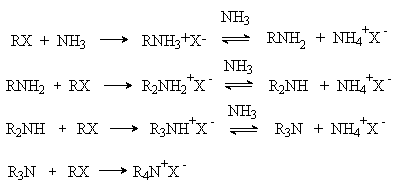 1) Алкилирование аммиака и аминов. Аммиак взаимодействуют с алкилгалогенидами RX и другими алкилирующими реагентами (алкилсульфатами, диалкилсульфатами) с образованием на первой стадии соли алкиламмония, которая в равновесной реакции с избытком аммиака дает алкиламин. Алкиламин далее вступает в реакцию c алкилгалогенидом с образованием продукта диалкилирования и т.д. Таким образом последовательно образуются триалкиламин и соль тетраалкиламмония.
