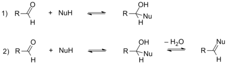 Альдегиды содержат поляризованную карбонильную группу и склонны присоединять нуклеофильные реагенты, как нейтральные (аммиак, амины, воду, спирты, тиолы и др.), так и анионные (цианид-ион CN-, алкоголяты, гидрид-ион H-,карбанионы и др.). За исключением реакций восстановления гидридами типа алюмогидрида лития LiAlH4, а также взаимодействия с реактивами Гриньяра, данные процессы являются обратимыми. Необходимо также различать два типа обратимых реакций присоединения: первый тип приводит к образованию тетраэдрического продукта присоединения, а второй тип включает в себя также последующую реакцию дегидратации, в результате которой происходит образование двойной связи между электрофильным атомом углерода и нуклеофилом. Реакции второго типа характерны, в основном, для азотсодержащих нуклеофилов[27].