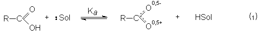 На силу карбоновых кислот оказывает влияние структура углеводородного радикала и природа заместителей в нем. Электроно-донорные заместители дестабилизируют карбоксилат-ион и ослабляют кислотные свойства. Электроноакцепторные заместители за счет эффекта способствуют лелокализации отрицательного заряда в карбоксилат-ионе, повышая его устойчивость, что приводит к повышению кислотных свойств. Основность карбоновых кислот В кислой среде (pH<3) диссоциация карбоновых кислот практически не происходит, так как равновесие (1) существенно смещено в левую сторону из-за избытка ионов HSolÅ. В то же время в кислой среде осуществляется протонирование карбоновых кислот по основному карбонильному кислороду.