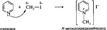 Атом азота в пиридине проявляет нуклеофильные свойства, например в реакциях с алкилгалогенидами. При этом получают четвертичные алкилпиридиниевые соли.