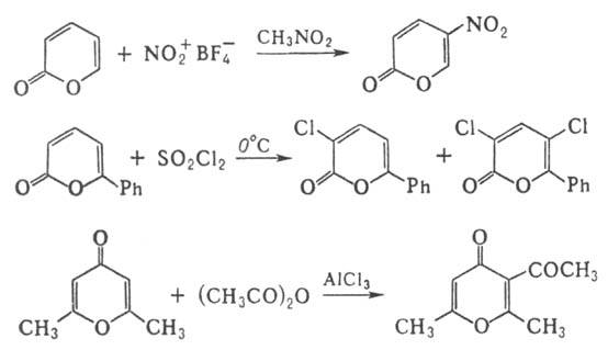 a-Пирон и его производные обладают св-вами непредельных d-лактонов и легко вступают в р-ции нуклеоф. замещения, к-рые обычно сопровождаются раскрытием цикла, напр, легко гидролизуются в присут. щелочей по связи С—О цикла: