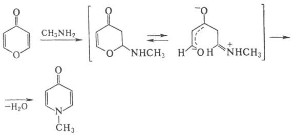 При действии NH3 или первичных аминов a- и g-пироны превращ. в пиридоны, напр.: