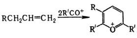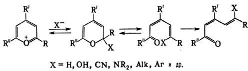 g-Пирон и его производные в отличие от a,b-ненасыщ. кетонов с трудом вступают в р-ции присоединения и, как правило, не образуют производных по карбонильной группе (оксимов, фенилгидразонов, оснований Шиффа). Для них характерна способность под действием HClO4 или ее производных превращ. в соли пирилия, напр.: