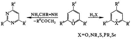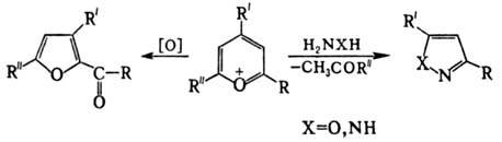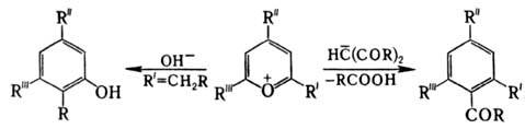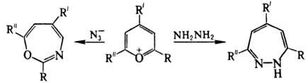 Формирование карбоциклич. шестичленных соед. осуществляется в р-циях с СН-кислотами и при взаимод. a-алкилзамещенных пирилия солей со щелочами или вторичными аминами: Образование семичленных соед. наблюдается в р-циях пирилия солей, напр., с азидами и гидразином:
