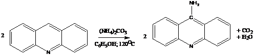 9-аминоакридин представляет собой светло-желтый порошок. Общим методом синтеза аминоакридонов служит восстановление амино- и нитроакридонов амальгамой натрия. [1] Обычно нитроакридоны восстанавливают в спирте, хотя применение воды в качестве растворителя дает такие же результаты и сопряжено с меньшими трудностями. "Перевосстановление" в соответствующий акридан является обычным при работе по этому методу. Выходы колеблются в пределах - от 60 до 85%; проведение всего процесса занимает около 6 ч. Каталитическое восстановление или восстановление в кислой среде нитроакридинов, экономически невыгодно, хотя оно является единственным методом синтеза 1,3-диаминоакридина. 9-аминоакридин можно получить несколькими способами. Один из них – это получение его из 9-хлоракридина нагреванием с карбонатом аммония в присутствии фенола: [5,6] (уравнение 4)