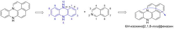 Аналогичным образом составляются и названия пери -конденсированных гетероциклических систем (в отличие от орто -конденсированных гетероциклов, циклы в пери -конденсированном гетероциклическом соединении имеют более чем одну общую сторону). В данном случае необходимо перечисление всех атомов и сторон сочленения в том порядке, в котором они встречаются при обходе основного цикла[19].
