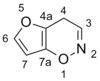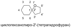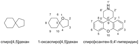Нумерация в молекуле 4 H -фуро[2,3- e ]-1,2-оксазина После составления названия конденсированный гетероцикл нумеруется заново как целое соединение. Обычно нумерация начинается с атома, соседнего с местом сочленения циклов, но так, чтобы гетероатом получил наименьший номер. В неопределённых случаях наименьший номер следует присваивать более старшему гетероатому, то есть такому, который находится выше в таблице приставок по номенклатуре Ганча — Видмана. Атомам углерода, принадлежащим двум циклам, присваиваются номера с индексом а [20]. Номенклатура гетероциклических спиросоединений[ Гетероциклические спиросоединения, которые состоят из двух моноциклических частей, называют, добавляя к названиям соответствующих карбоциклических спиросоединений а -приставки, используемые в заменительной номенклатуре. При этом названия карбоциклических спиросоединений составляются по обычным правилам: вещество получает название по числу атомов углерода в обоих циклах с добавлением приставки спиро - и указания числа атомов углерода в каждом цикле (не считая спироатома) в квадратных скобках, например, спиро[4,5]декан. Нумерацию гетероцикла проводят как обычно в случае спиросоединений, но так, чтобы гетероатом по возможности получил наименьший номер. Соответственно, гетероциклический аналог в данном случае получит название 1-оксаспиро[4,5]декан[21]. Если гетероциклическое спиросоединение состоит из более сложных спиросочленённых компонентов, то названия этих компонентов заключаются в алфавитном порядке в квадратные скобки, а перед скобками помещается приставка спиро -. Положение спироатома указывается при помощи локантов между названиями компонентов спиросистемы[21].