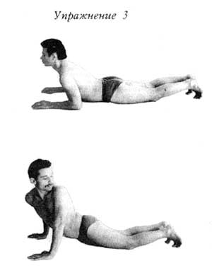 Третье упражнение. Чтобы вода продолжала двигаться по тонкому кишечнику, надо выполнить вариант кобры, но при этом большие пальцы ног должны касаться пола, а бедра, следовательно, должны быть приподняты над полом. Ступни раздвинуты на 30 см это очень важно. Приняв такое положение, поворачивайте голову, плечи и туловище, до тех пор пока не увидите противоположную пятку(если поворот делаете вправо, то увидеть надо левую пятку). Опять же не останавливаясь вернуться в исходное положение и выполнить поворот в другую сторону. Повороты делаются только верхней частью туловища, нижняя остается, неподвижна и параллельна полу. Допустимы только прогибы вниз. Двойное упражнение повторяют 4 раза. Продолжительность 10 – 15 секунд.