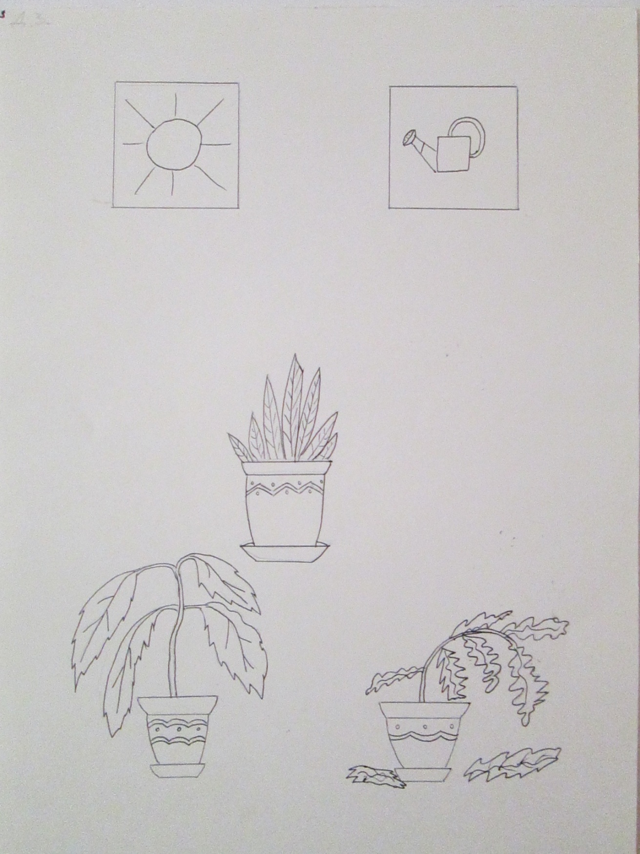 -Какое растение грустит? -Чего ему не хватает? -Покажи стрелочкой.