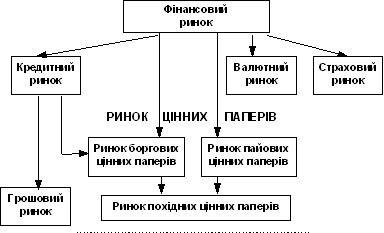 Ринок цінних паперів в Україні нині складається з ринків акцій, державних та муніципальних облігацій внутрішньої позики, облігацій підприємницьких структур, казначейських зобов’язань, векселів, інвестиційних, ощадних, майнових і компенсаційних сертифікатів, житлових чеків, облігацій зовнішньої позики. Тож, залежно від класифікаційних ознак фінансовий ринок поділяється (рис.1.1):