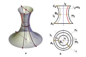 Рис.10.1 Линия поверхности вращения, лежащая в плоскости, проходящей через ось вращения, называется меридианом. Все меридианы поверхности вращения равны между собой. Меридиан, лежащий в плоскости уровня, называется главным. Множество всех параллелей или меридианов представляет собой каркас поверхности вращения. Через каждую точку поверхности проходит одна параллель и один меридиан. При изображении поверхности вращения на комплексном чертеже обычно поверхность располагают так, чтобы её ось i была бы проецирующей прямой. На рис.10.1(а) приведена поверхность вращения, образованная при вращении кривой l. В качестве оси вращения используется горизонтально проецирующая прямая i. Комплексный чертеж поверхности приведён на рис.10.1(б). Экватор поверхности вращения описывает точка А образующей, а горло – точка В. Меридиан m лежит в плоскости Δ, а главный меридиан – в плоскости Σ. В данном случае очерком поверхности вращения на горизонтальной плоскости проекций П1 является проекция экватора, а на фронтальной плоскости П2 – проекция главного меридиана. Геометрическая часть определителя поверхности вращения Φ состоит из образующей линии и оси вращения: Φ(l,i), где l – образующая линия поверхности, i – ось вращения. Алгоритмическая часть определителя поверхности вращения состоит из операции вращения образующей вокруг оси и построения каркаса параллелей необходимой плотности. Для построения точки, лежащей на поверхности вращения, необходимо провести вспомогательную линию на поверхности (обычно параллель или меридиан), и расположить проекции точки на одноименных проекциях вспомогательной линии. Поверхности вращения получили самое широкое применение в деталях различных механизмов и машин. Основными причинами этого является, с одной стороны, распространённость вращательного движения, а с другой стороны – простота обработки поверхностей вращения. 2. Поверхности вращения, образованные прямой линией Вращением прямой линии можно получить следующие виды поверхностей вращения: