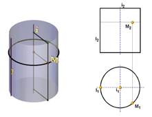 Рис.10.6 Рис.10.7 На рис.10.8 приведён комплексный чертёж открытого тора, заданного образующей окружностью m и осью вращения i. Очерком поверхности на плоскости П1 является проекции экватора и горла, а на плоскости П2 – проекция главного меридиана (две образующие окружности. Тор является поверхностью четвертого порядка, поэтому пересекается произвольной прямой в четырех точках.