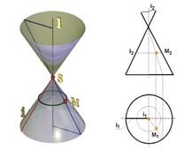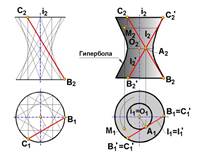 Рис.10.4 Поверхность имеет две образующие линии l (ВС) и l' (В'С'), наклоненные в разные стороны. Эти образующие пересекаются между собой. Точка их пересечения лежит на наименьшей параллели (в данном случае в точке А). Отрезок ОА является кратчайшим расстоянием между образующей и осью. Таким образом, на поверхности однополостного гиперболоида располагаются два семейства прямолинейных образующих. Все образующие одного семейства - скрещивающиеся прямые. Каждая образующая одного семейства пересекает все образующие другого. Через каждую точку поверхности проходят две образующие разных семейств. Меридианом поверхности является гипербола. Рассмотренные поверхности вращения можно отнести и к классу линейчатых поверхностей, так как они образованы в процессе движения прямой линии. Кроме того, поверхности являются поверхностями второго порядка: максимальное число точек пересечения каждой из этих поверхностей с прямой общего положения равно двум. Построение точки на таких поверхностях можно выполнить при помощи параллели или при помощи прямолинейной образующей. 3. Поверхности вращения, образованные окружностью Вращением окружности можно получить следующие виды поверхностей вращения: